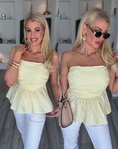 Az alap szín és a klasszikus fekete pöttyök időtlen, enyhén vintage hangulatot kölcsönöznek, így tökéletes választás elegánsabb és hétköznapi szettekhez. Mellbetéttel, kisebb kosárra ajánljuk.