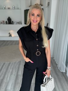 A blézeren a gomb felett egy arany kitűző kapott helyet, amely luxus hatást kölcsönöz a szettnek. A nadrág laza, mégis nőies szabású, amely szépen követi az alakot, miközben kényelmes viselet marad. A minimalista, letisztult design lehetővé teszi, hogy sportosan sneakerrel vagy elegánsan magassarkúval is viseld.